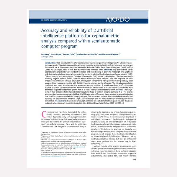Nos complace compartir que nuestro socio de número, Dr. Ian Raby, ha publicado un reciente artículo en la revista AJO-DO titulado: “Accuracy and reliability of 2 artificial intelligence platforms for cephalometric analysis compared with a semiautomatic computer program”. El Dr. Raby ha compartido con nosotros el paper en su formato final, a través del siguiente enlace: Accuracy-and-reliability-of-2-artificial-intelligence-platforms-for-cephalometric-analysis-compared-with-a-semiautomatic-computer-program.pdf